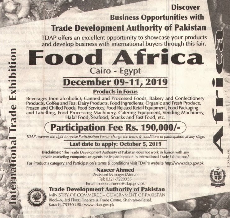 TDAP is organizing participation in the subject event which will be held from 9 to 11 December, 2019 at Cairo, Egypt. The advertisement has been released in national newspapers today (19-09-2019) and also available on TDAP web Portal. |